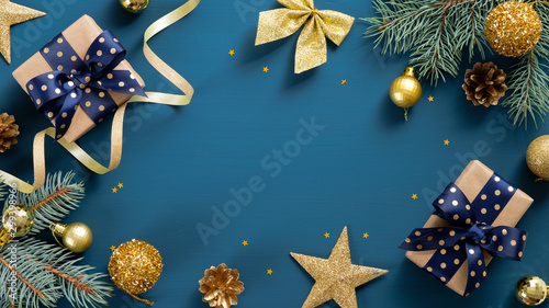 Christmas Frame On Blue Background Flat Lay Xmas Tree Branches